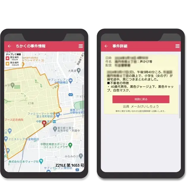 - お子さまの今いる場所と連動して、お子さまの近くで起きた事件情報を地図上に表示します。事件情報は、エリア内の警察から提供されています。